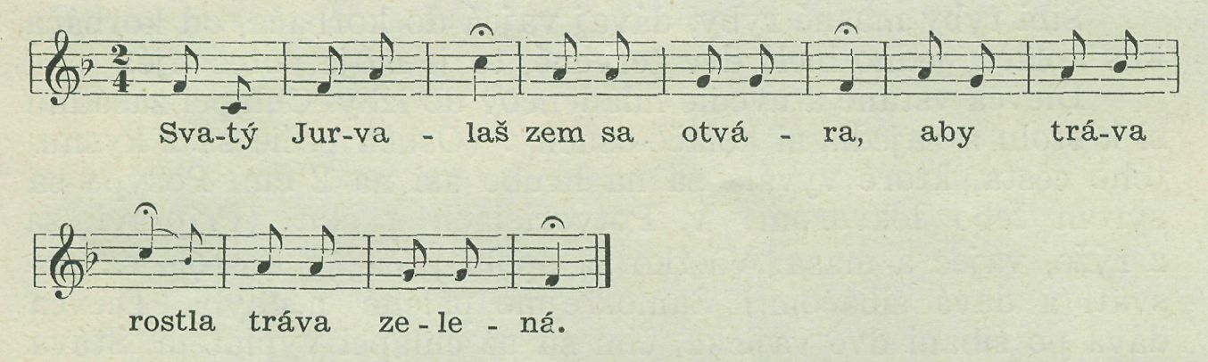 Tráva zelená, vyše kolena šeljaké kvietky biela lalia. Bielá lalija modro prekvitá, už ma ten šuhajko od manky pýta. Daj ma, mamko, daj, len ma ne chovaj, čo ma toľko chováš vačču škodu máš. Sv. Jur ide leto nám nese, leto, leto i nám poctivým pannám a tym nepoctivým ešce kabanám.