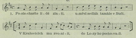 2. V Nekmíři mu rakev dali, z Číhané přinesli máry. Pří-krov z města Manětína, hrobař přišel až z Liblína.