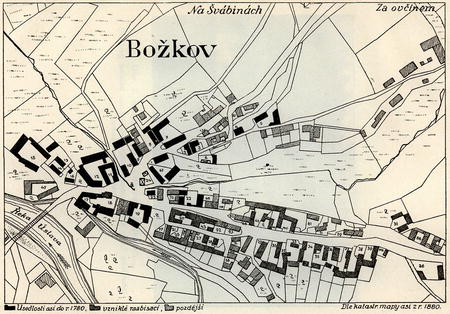 Obr. 1. Plán obce Božkova u Plzně s vyznačeným vývojem vzrůstu obce.