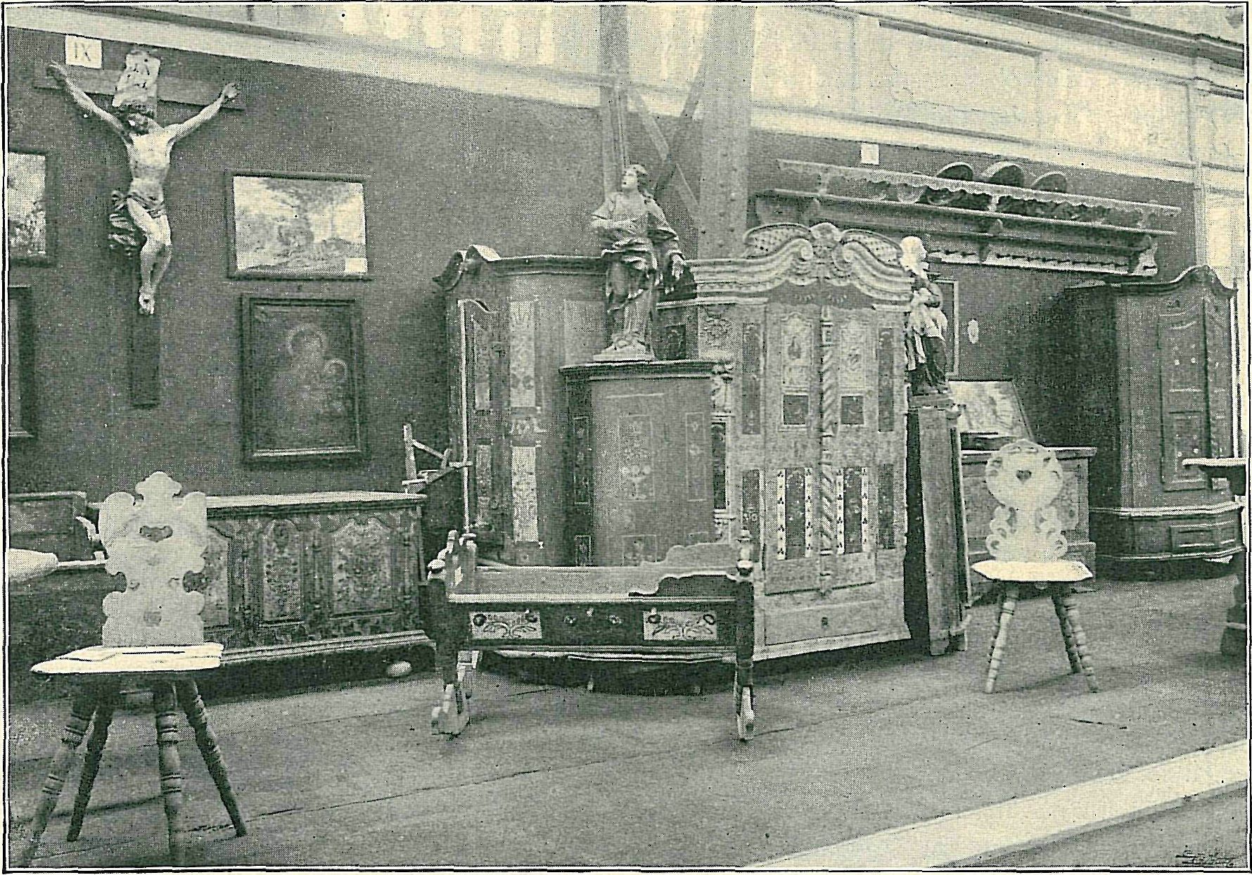 Pohledněme nejprve do západního křídla paláce. Hned při vstupu do něho — v jakémsi vestibulu — pozdravují nás skupina svatebčanů z Blatska a sochy králův Karla a Václava a malířské výzdoby stěn. Ubírajíce se kolem blatské svatby, vstoupíme do velikého čtverce paláce, naplněného vysokými a nízkými úpravnými skříněmi, jež všechny, jak tu jsou, obsahují neobyčejné bohatství výšivek, krajek a ozdobných částí krojových. Zde jest na tisíce předmětův, jeden krásnější a pestřejší druhého — na pravo z Čech, na levo z Moravy, Slezska a uherského Slovenska. Sem a tam stojí krojová figurína, na skříních připojeny fotografie krojů a jejich součástí.