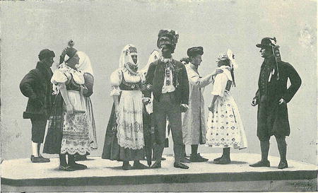 Ale tu již se ociťujeme z Moravy a Uher v Čechách, ve kterých zůstaneme po celé druhé polovině návsi. Míjíce úpravnou rybárnu, docházíme k omšenému, přímo poetickému mlýnu českému, od toho k trojdílné chalupě z jižních Čech a dále k ozdobné chalupě z okolí Jaroměře se světničkou v prvním patře, postavenou na hlavní stěně chalupy a na dvou dřevěných sloupích. Věnčí ji pavláčka. Za chalupou jaroměřskou rozkládá se široký statek z východních Čech — dosti podobný horáckému statku z Moravy — a několik kroků dále statek chodský, jehož »sklep« (srub) jest pravým starým srubem hradebním. Ostatně i celé založení chodského statku s okny a dveřmi téměř výlučně obrácenými do dvora zevšad pevně obehnaného dává dojem stavení, zřízeného k obraně proti škůdci z venčí příchozímu. Jak volným, otevřeným a přívětivým se jeví sousední statek pojizerský! Tu spojeno jest bohatství s úpravností a ozdobou, ze kterých směje se hojnost a přebytek na domácího i hosta. U Chodů ponurost, tady veselí — tam zápas, tady »život« . . . Hle jak povaha krajiny a větší neb menší úrodnost půdy jeví se věrně i v těch uprostřed přírody rukami lidskými zbudovaných přístřeších! . . . Ta celá vesnice mluví k vám každým svým stavením a mlčky vypravuje vám již tím obšírně a důkladně o lidu a lidech každého jednotlivého kraje . . . Nelze si mysliti poutavější národopisné přednášky nad tu, kterou k vám tady mají ty tiché statky a chalupy . . .
