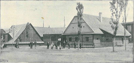 je vyzděna až do výše. Trámy spojeny jsou v rozích plátem s rybinou. Mezery mezi jednotlivými trámy (t. zv. lišty) vyplňují se mechem, a pak vymažou se zvláštní mazaninou, t. j. hlinou, smíchanou s plevami, nebo řezankou. Podlaha jest z prken, kteráž přibila jsou na trámcích, jež spočívají na podezdívce svými konci. Jen před kamny a pekárnou zůstává pouze udusaná země.
