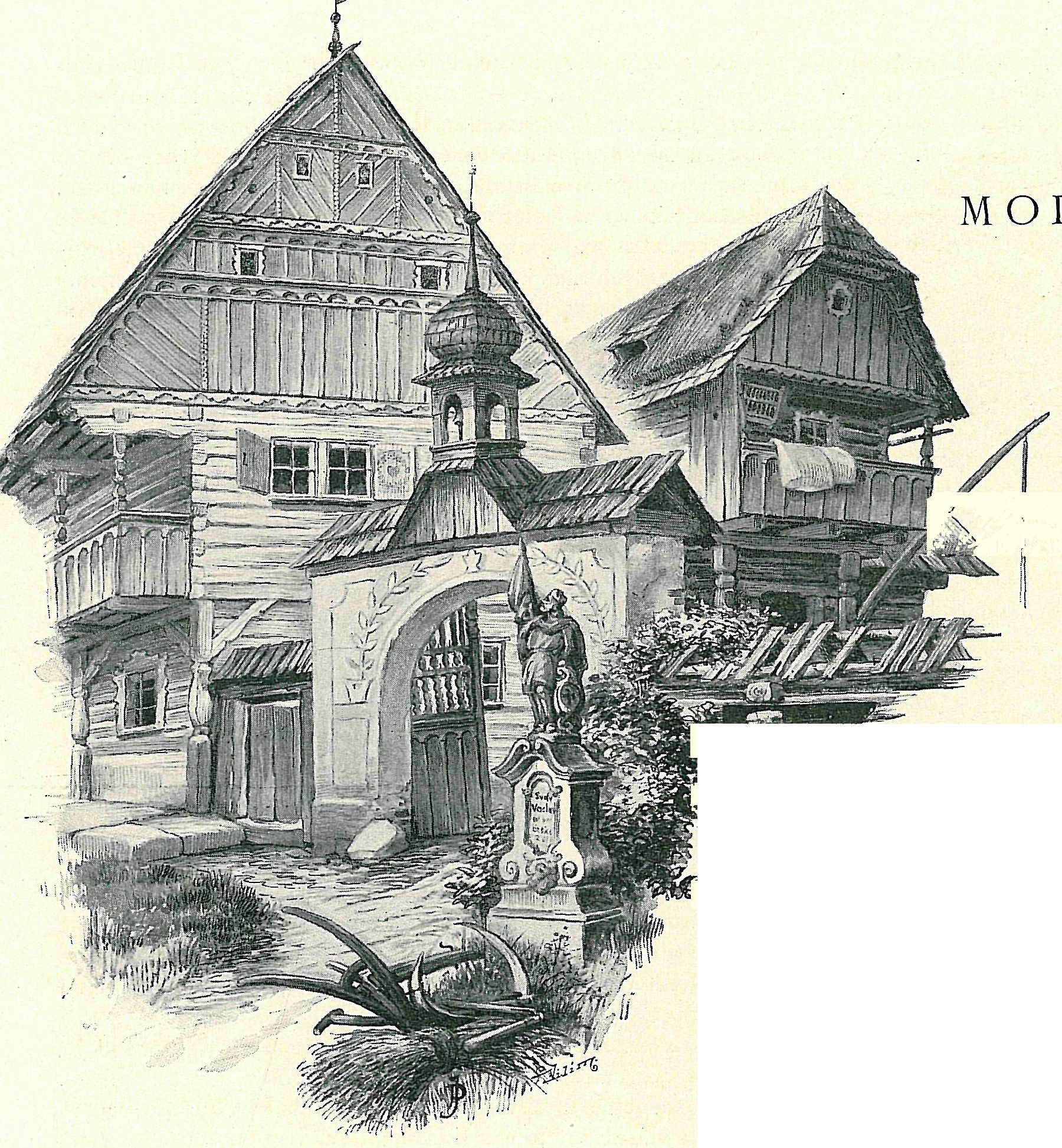 Modely jednotlivých budov. Ze staveb moravských Slováků*) zasluhují zmínky obydlí mezi Hodonínem a Kyjovem, ještě rázovitější shledáme ve Tvrdonicích, Kosticích, Staré Břeclavi a Lanžhotě. Nebývá v celé jižní Moravě velkých a výstavných statků, skorem samí čtvrtláníci, jen tu a tam půlláník (který na čtyřicet korců počítá polí). Chaloupky podél cesty rozložené stavěny z největší části z cihel nepálených, z hlíny pouze uplácaných. Je-li stavěno ze dřeva, což se zřídka stává (můžeme počítati stavby takové za starší, kdy ještě bylo v lesích dostatek dříví), bývá přečasto a zvláště v jižní Moravě vyzděn aspoň výstupek žudro »žebračka«. Skoro všechna stavení jihomoravských Slováků mají základní jeden typ, jehož ukázku jsme poznali již při tvrdoňské chalupě.