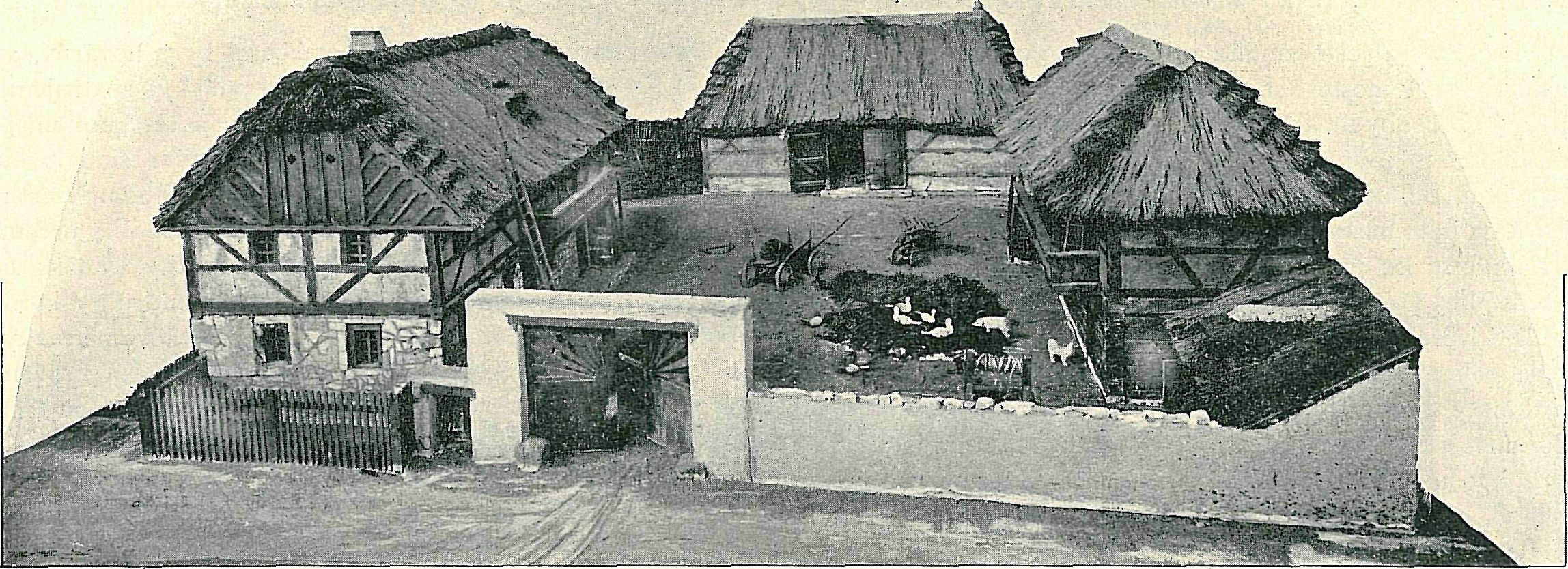 Přicházíme do okresu slanského*) kde spatříme zvláštní způsob staveb lepenicových a hrážděných, dle mnohých kritiků lidových staveb původu německého. I kdyby tomu tak bylo a použilo se způsobu cizího při provádění stavby, přece celek, tvar a detaily nezaprou lidové stavitelství české, jak možno i na malém důkazu vystaveného modelu statku slanského spatřiti. Vstoupíme brankou, která se nachází v sousedství vrat osazených ve zděných pilířích, do
