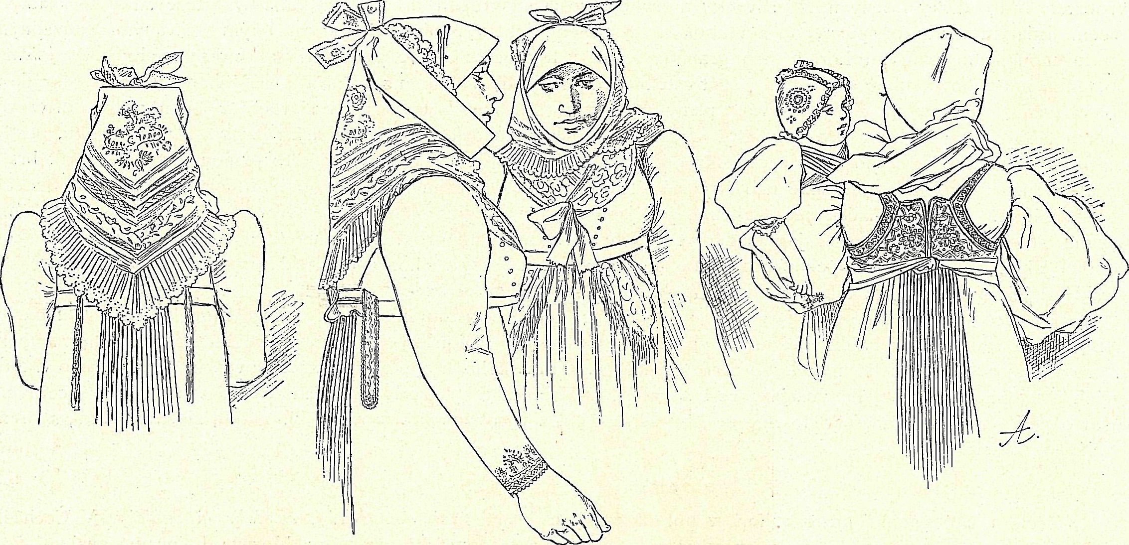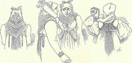 Na úboru žen a dívek méně zajímá vyšívání, nehojné, než pestrota a leckterý tvar osobitý. Střevíčky černé kožené, hojně dírkované, vytloukané, zdobené přeskami a rosetkami, nošeny k punčochám červeným, připevněným »ouvazkem«.*) Sukně, hustě vrapovaná, obyčejně červená neb modrá, olemována dole buď úzce neb opatřena pentlí (»pantlem«) takovou, by se barvy lišily. Zhotovena byla ze »šarky« dle libosti obarvené (podobá se to mezulánu); »cýkovky«, »cajkovky«, na příč tkané, rovnají se »cajčkám«. Dle Erbena nosily se sukně trojí a sice v rozličné časy roční a k různým příležitostem: červené »jasné« či veselé a červené »smutné«, modré a konečně zelené. Fěrtoch býval někdy bílý, vyšívaný, častěji hedvábný, pestře květovaný, konečně i vlněný, žlutě a červeně pruhovaný. (Těmto fěrtochům podnes říká se »ténské«, »týnské« snad podle místa, kde jsou vyráběny.) Košile, která nazývána po moravsku »ru-kávcemi«, mívala okruží a »drcek«, šněrovačka byla nízká, v bocích opatřena »jelity«, za stara měla i »punt«, vložku to okrouhle portou zlatou ozdobenou. Novější šněrovačky na postranicích pokryty jsou hustou spletí dracounu, perliček a cetek, že základ hedvábný neviděti; jiné, damaškové, připomínají čtyřkvětáky.