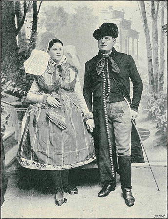 Kroj chodský přese všecku barvitost ve formách svých je úměrný a jaksi vážný. Toho nelze tvrditi o blízkém kroji plzeň-ském (hlavně ovšem pokud se týče žen), jehož tvary jsou roz-bujnělé, až pitvorné, a jemuž pouze jemnost a uměleckost bělostných výšivek, čepců-holubi-nek, jich křídel či »kalounů« a loktušek dodává noblessy. Zjev staré Plzeňačky v četných jejích zvonovitých sukních pouze ke kolenům sahajících, v ohromných do šíře metru rozpjatých křídlech jejích čepců a sametových stužkách kolem čela více-kráte ovázaných, má do sebe cosi groteskního.**) Trochu je i v kroji znáti náladu kraje bohatého — Čech, dobře-li se mu vede, vždy jest bujný!