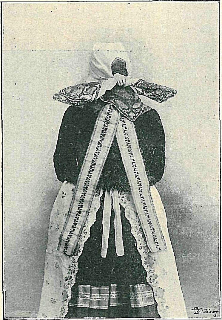 Úbor ženský počátkem věku poskytoval v Ještědsku asi tento obraz: Nízké střevíčky, punčochy červené s »cviklem" vyšívaným; v den všední sukně modrá plátěná nebo »kanduš« (sukně s životkem bez rukávů), dne neděl-ního nebo svátečního sukně mezulánky, cajčky, »vokenačky« a »mustrované«. Pod mezulánky a cajčky, vždy pestrou »lemovkou« opatřené, že byly nesmírně těžky a tuhy, »až stály«, bylo lze bráti jen málo spodniček z velmi hrubého plátna. Košile starodávná měla široké sbírané rukávy, okruží (na Turnovsku »vejložek«) vyšívané, krajkami a »krešlič-kama« (penízky či cetkami) posázené. »Životek« byl vzadu velmi vysoký, skorem ke krku, zpředu trochu vystřižený, hedvábím prošívaný, širokými i úzkými »prýmy« pošitý, ze sukna nebo manšestru všedního, z damašku, často růžového, nedělního času. Vzadu na ramenou přišívány široké »mašle«. Takto v »životky« sešněrovány, chodily ženštiny až do zimy i do kostela; za mrazu oblékány kabátky s rukávy velmi úzkými, širokou pentlí zdobenými. Fěrtochy bývaly z lehkého hedvábí, široké, o 3 půlích (jen pro nevěstu brány 4 půle), žluté, modré, zelené. Chudší užívaly zástěr kosmonoských a takových i sukní a šátků. Svobodné holky nosily na hlavě pouze »kukli«; jsou to svrchu zmíněné bílé šátky o vyšívaných rozích, s krajkami jen na uších viditelnými. »Kukle« škrobily a upravovaly zvláštní švadleny, jež je na palicích hliněných za vlhka zadrhovaly. »Kuklu« dívky ani ženy (jež pod ně nosily čepce »selské« též »s ušima«) nerozvazovaly, sjímaly ji s hlavy jako klobouk, dokud se nezmačkala a nezaprášila; vydržela jim obyčejně přes léto, jsouc pečlivě do truhly ukládána. Pod kuklou nesmělo býti viděti ani vlásku, dívky zastrkovaly vlasy nožem nebo držadlem lžíce. Družice a nevěsta zapletly si vlasy v rulíky, ty zase spořádaly vzadu v »košíček« a kladly na temeno hlavy vysoký věnec ze samých růží; bylo-li k půlnoci a sundaly-li ženy v komoře nevěstě zelený věneček, oblékly jí hladký čepec, přivázaly nad čelo vínek (jenž jako na Turnovsku býval nejčastěji vyšit červeným hedvábím a »krešličkama« posázen) a posadily na hlavu »novou kukličku«. O svatbách tancovávaly ženy jen ve víncích a v oněch prostých, neškrobených »selských čepcích«, jež mají krajky na uších. Tyto čepce panovaly velmi dlouho a měly v Ještědí, jak lid praví, »velikou moc a víru«. Šestinedělka musila míti čepec každý den na hlavě a byla-li v poli za chystající se bouřky, zčerstva běžela domů pro čepec, obávajíc se, že jinak by hrom do ní uhodil. Totéž vypravovali ještě r. 1893 ve Střenici (českém klínku v německé části Litomyšlska) o malých čepečcích prolamovaných, jež jsou žlutým hedvábím přímočárným ornamentem protahovány.
