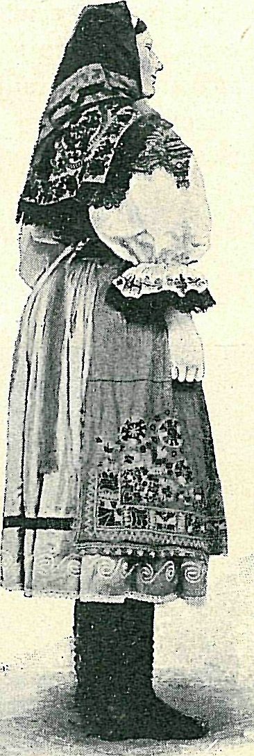 kol krku a rukou i na přeložených šůscích. V Sudoměřicích mívá širokou pelerýnu z liščí kožešiny. K svatebnímu úboru na Lanžhotě patří i pěkné »šuby«-černomodré se šňůrováním červeným a černou beránčinou pre-mované. Druhdy nosívaly tu i červené, modře šňůrované, liščinou premované »mentýky« téhož tvaru jako černomodré na Nivnicku a světle modré na Velecku. Tu přestávají premovati je liščinou, za to zdobí je černou beránčinou.