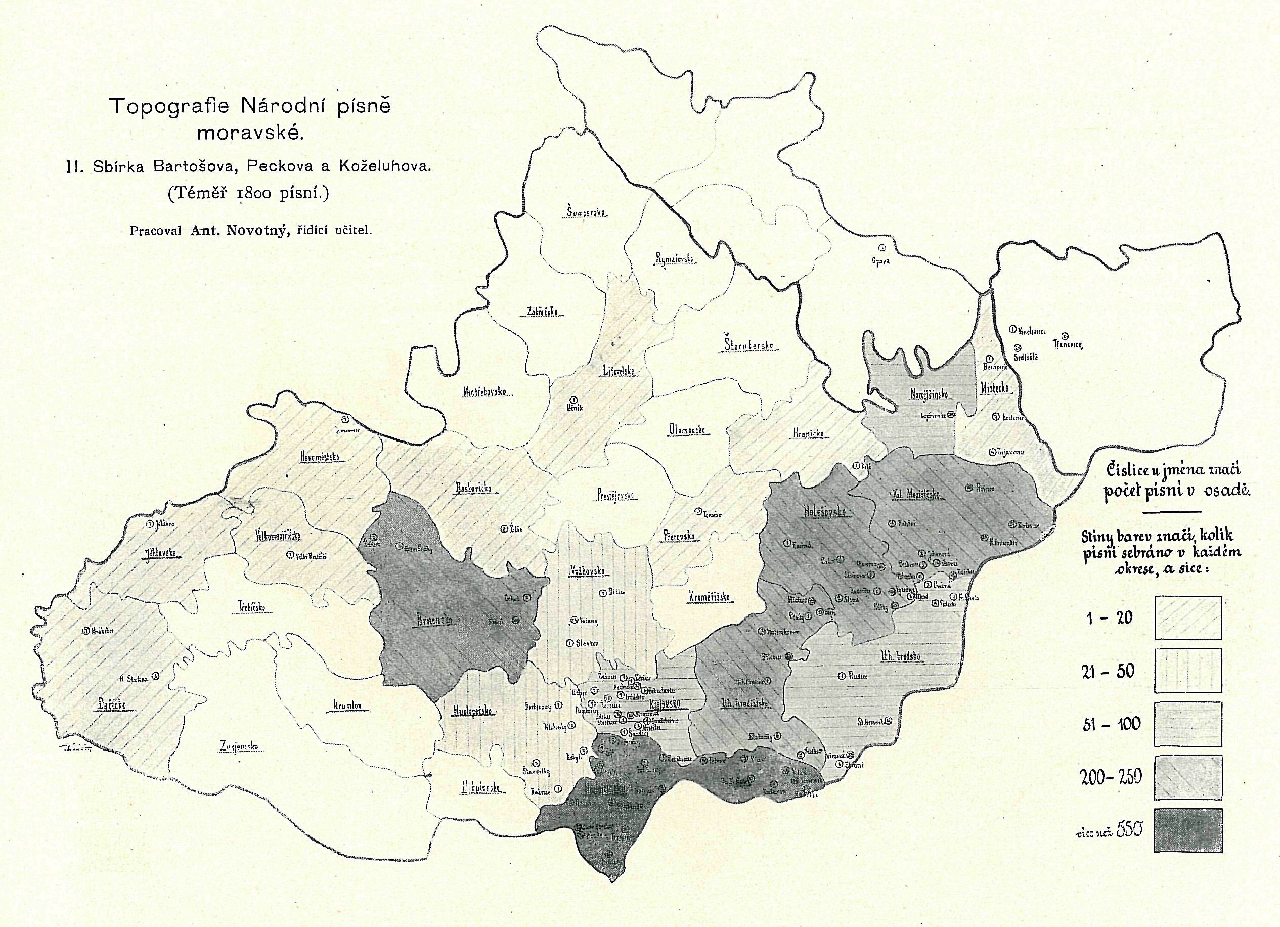 vykázati žní nejbohatší, již předem zasílali jen to, co v Erbenově sbírce nápěvů nenalézali. Výtěžek z Moravy byl ovšem značně menší, ač i zde počet nově nasbíraných nápěvů a variantů dosahuje půl tisíce, počítáme-li právem i všechno to, co následkem národopisného ruchu výstavu předcházejícího a zejména u příležitosti krajinských výstavek a slavností po různu již vytištěno bylo. Avšak nesmíme zapomínati na veliké množství nápěvů, jež v letech osmdesátých nasbírali a vydali neúnavní moravští pracovníci na poli tom, přede všemi arci Fr. Bartoš. Čechy, před tím Moravou značně předstižené co do hojnosti hudebního materialu písňového, prostě doháněly, pokud možno bylo — a výsledek odměnil práci tu měrou netušenou.