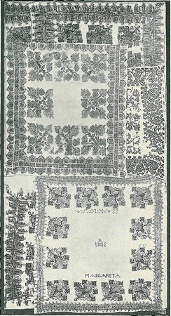 v celých Čechách, na Moravě i v Slezsku mohou se takovými vykázat. Nejzajímavější vyšívání tohoto druhu má široké okolí pražské. Řídká půda tvoří tmavé pozadí, z něhož široká pole lemující a rohové pole obloukovitě vymezené ostře vystupuje. Výzdobu tvoří motivy rostlinné formy karaf. zvonku a j., často nepatrně ba i naturalisticky podané a ovšem tak seskupené, aby živost tvarů a hravost výplní na první ráz byla patrna. Do této skupiny náleží též bílé vyšívání na jemnějších látkách rázu zcela moderního: okraje a rohové výplně šátečků z batistu a mulu.