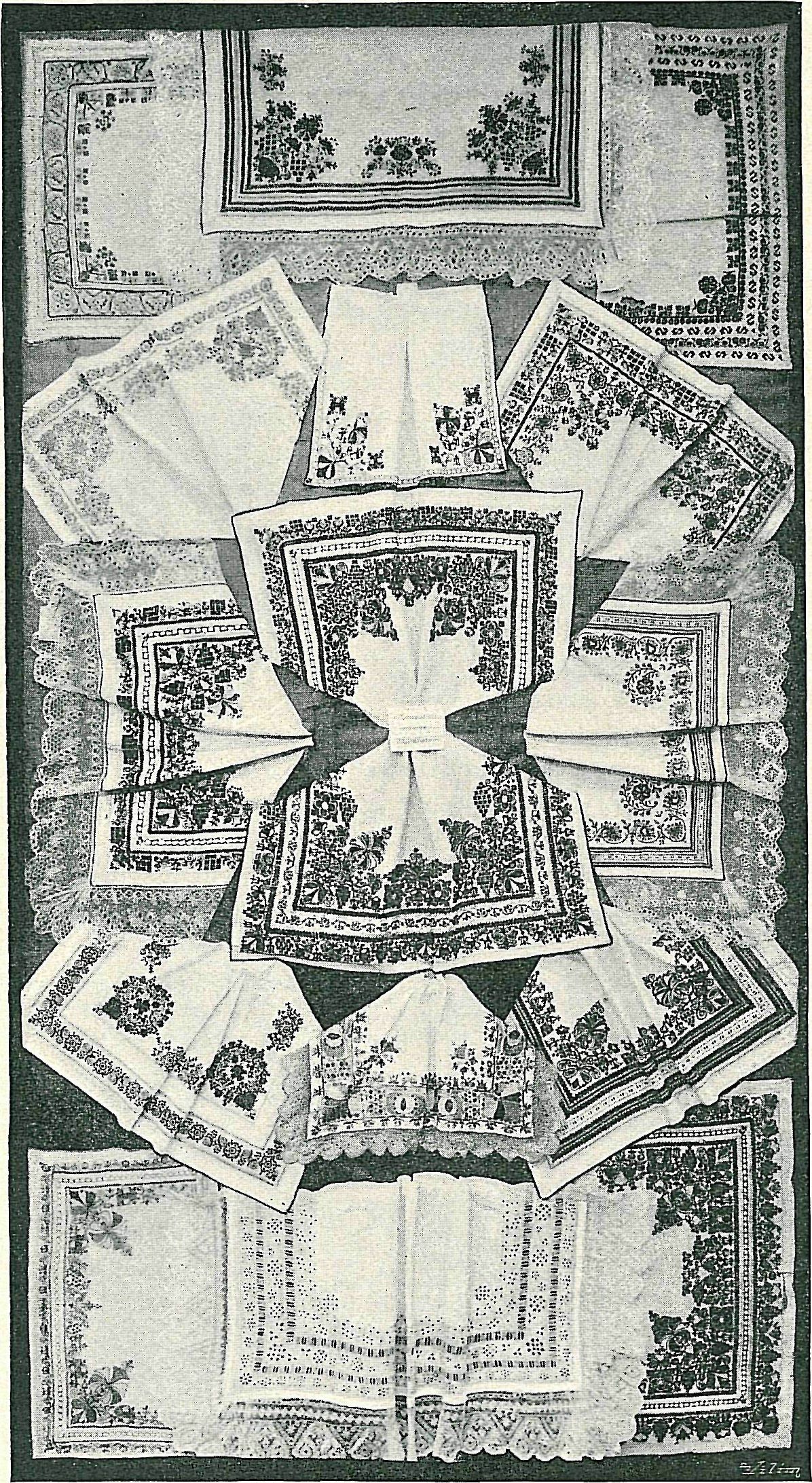 z otupělými rohy (osmiúhelník); 4. typ, kde jeden neb tři stromkovitě rozvětvené tvary »na tři dlapy« vynikají. Řada variací; 5. dýnko zdobí motiv, jenž ve svém rozčlenění pavouka (skřítka) nám připomíná. Zajímavo jest stopovat tento motiv v jeho vývoji na přečetných variantech, a v souvislosti s ostatními typy; 6. několik překrásných dýnek na husté půdě síťkované vyšívaných a prošívaných (filet antique). Zmínku zasluhují též starobylá dýnka s motivy neurčitého tvaru ojediněle po ploše rozvržené.