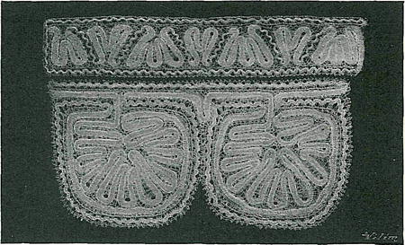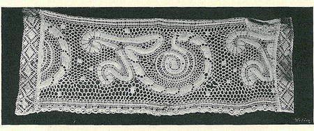 Nádherná kopie guipiry páskové, pouhá to variace čipky slovenské rovněž vystavené, s pěkným rostlinným motivem representovala ony umělecké vý-tvary ženských ruk, s nimiž setkáváme se hojně na vyšívkách českých, počínaje od Turnova přes Polabí až k Jindřichovu Hradci. Pronésti správný výrok o původu spanilých krajek těch jest nesnadno, protože u nás není již lidových výrob krajek páskových.