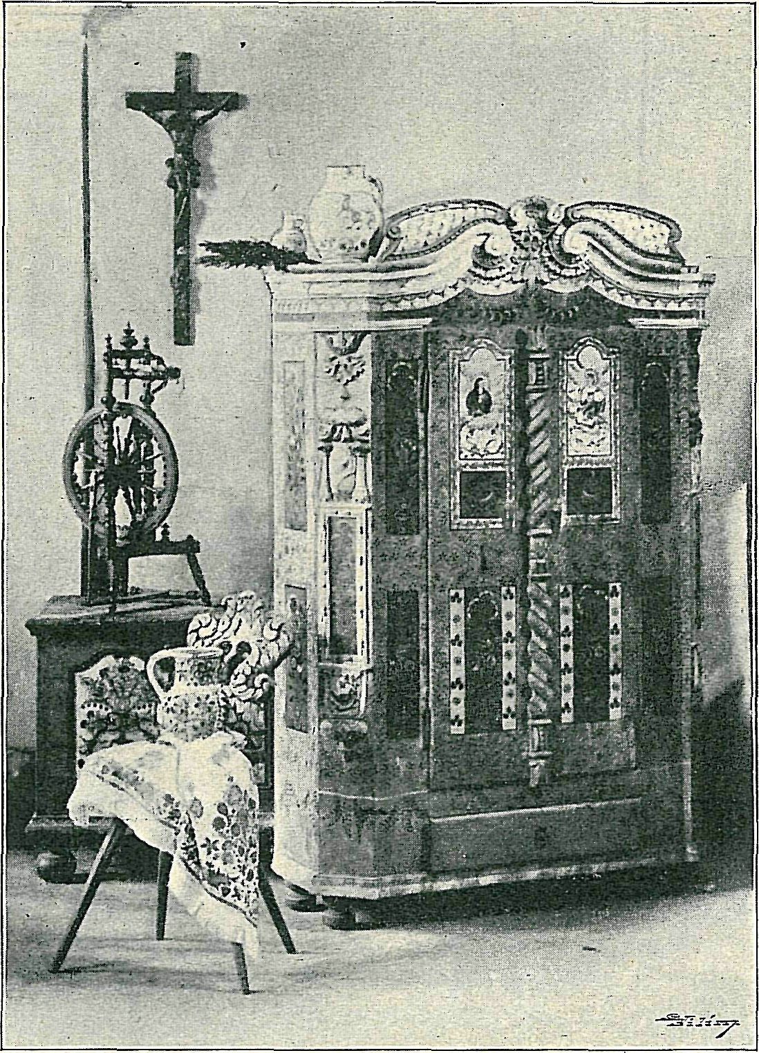 hruškové pod politurou prosvitající tvoří klidnější podklad k živé polychromu lidového ornamentu, nežli barevné podklady modré, zelené, červené na almarách měkkých. Jelikož pak se tu dvojí různorodé prostředky v celek spojují, vřadili bychom nábytek na po-lituru malovaný za přechod mezi nábytkem venkovským a městským.