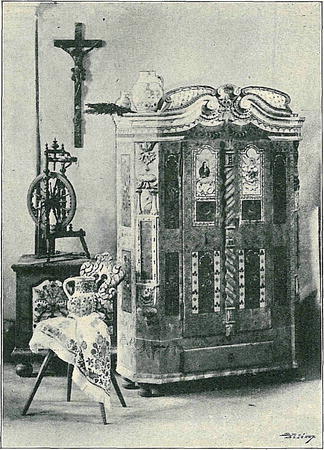 Oddělení nábytkové Národop. výstavy česko-slovanské obsahovalo více takových příkladů pojednání na almarách i truhlách pocházejících z prvé poloviny tohoto století. Předvádíme jeden z nich. Jest to na př. tmavohnědě leštěná skříň turnovská z roku 1845 se jménem majitelky: "Černyho Marije". Snad to byla almara určená pro nevěstu. Členění skříně prozrazuje vliv empiru. Malovány jsou na almaře jednak obrazy svatých (svatý Josef a P. Maria), jednak květinové festony a krajinky (vyobr. na str. 330).