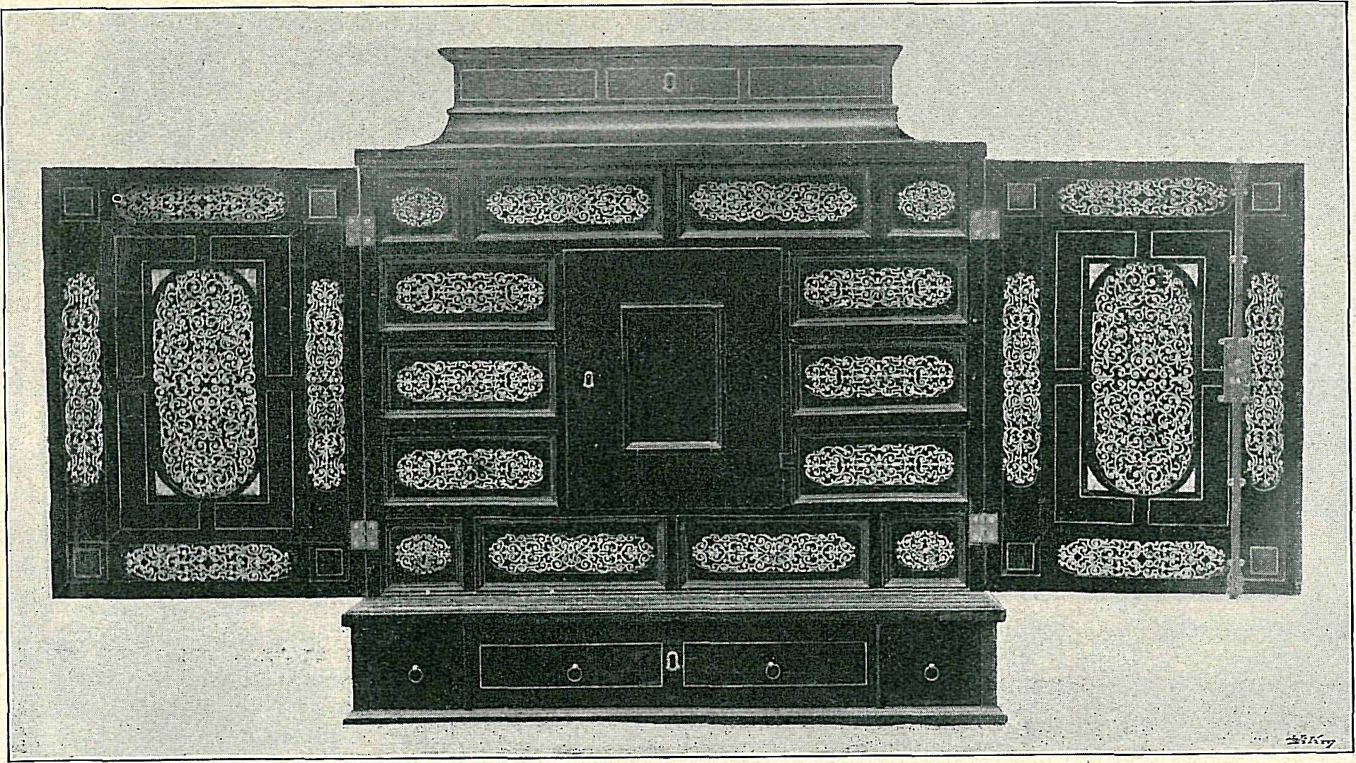 vidíme cínovník koutní z Příbrami. Jest to půvabné dílo barokní pěkných poměrů a plynulých linií. Povšimněme si zvláště vykládaných dveřní dolní almárky: v orámování jest kresba čistě geometrická, pozdvižená živě kontrastujícím flá-drem vložených dyh; u prostřed jsou figurky čilého posunu a dobré kresby připomínající postavy