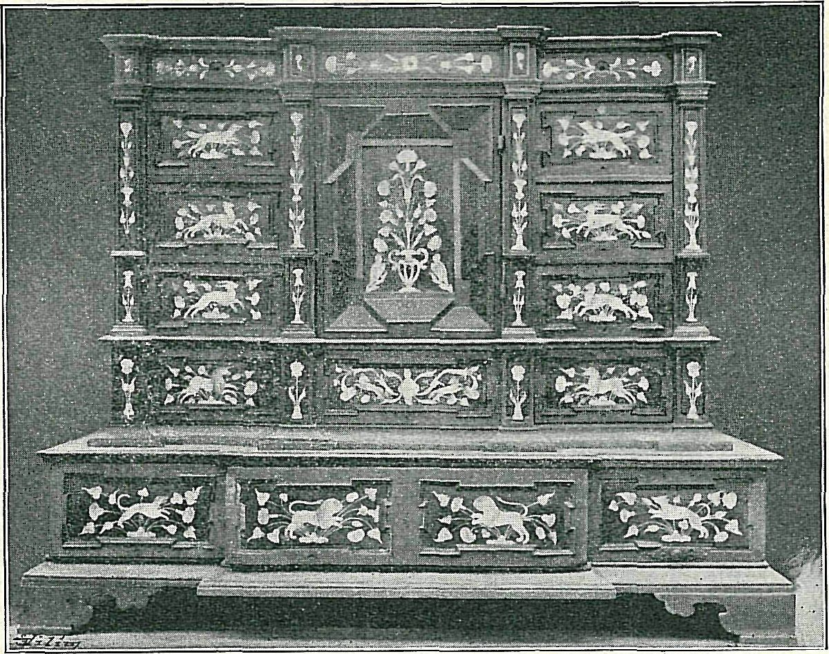 mohli bychom probírati skříně další, jež poutaly by nás především různými motivy práce vykládané: tu spatřili bychom na skříni říčanské papouška s motýlem, onde na mnichovohradištské význačné motivy domácí: ptáčata na větvičkách, tam zase na pardubické (snad ze sakristie vzaté) vyložené obrazy svatých. Ke skříním v blízkém vztahu jsou starobylé původní kredence — cínovníky (cinkostny). Po výšce jsou dvoudílné; na spodní plné almárce nebo prádelníku spočívá zasklená skřínka na cennější nádobí. V obr. na str. 333.
