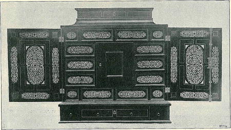 Jak zcela jiných prostředků užito bylo na skříni příbramské, rovněž době barokní přináležející. Při pardubické působil značný relief, zde jest řimsování velmi mírné a ku příznivému dojmu přispívají platně jednak ušlechtilé poměry celku, jednak intarsia v celých plochách kladená; neméně i nasazené prolamované kování dodává zajímavosti. — A tak
