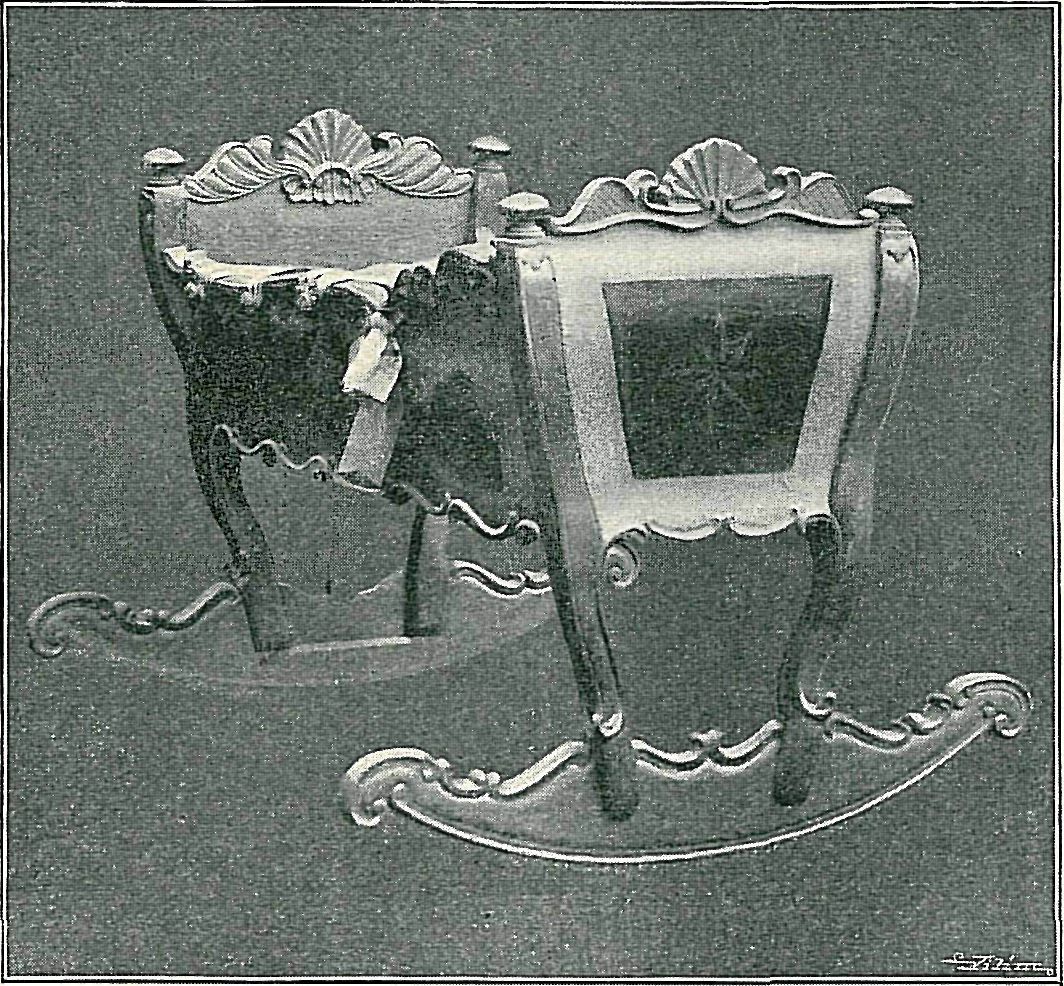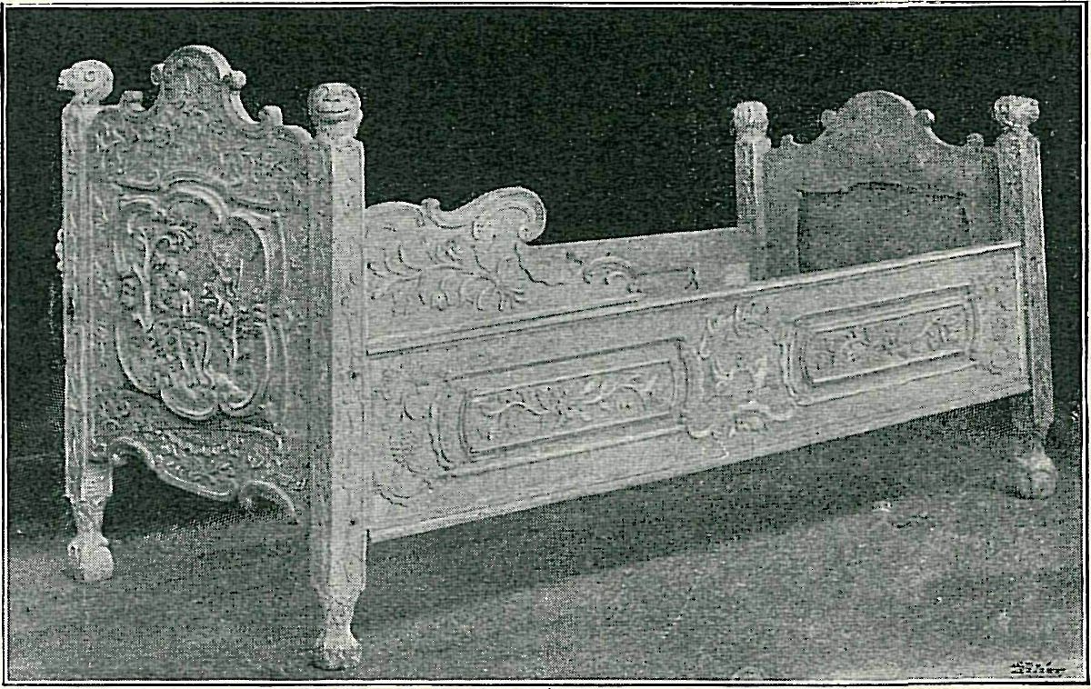 Prohlédnuvše některé pozoruhodnější truhly a skříně oddělení městského, vyčerpali jsme tím ony druhy, jež v četnějších ukázkách se vyskytovaly a tím vzájemného porovnání připouštěly. — Z osamělých ukázek ostatních uvádíme rokokovou postel. Byla celá pokryta těžkou plastickou řezbou ornamentální, na obou pelestech byly polovypuklé allegorické obrazy, toporné práce. Svého času byla postel asi polychromována. K posteli družíme barokní kolébku svižných linií zdobenou řezbou i vykládáním (hvězdami).