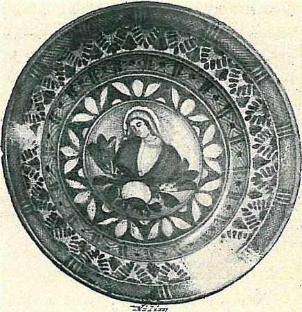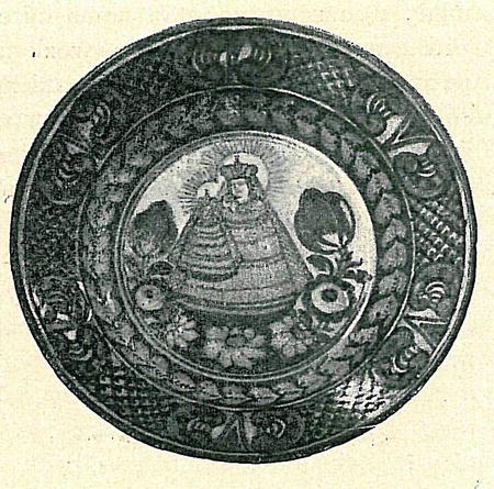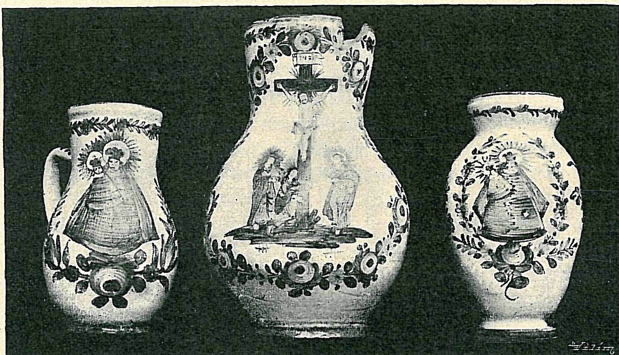 Vedle typů zmíněných je jich však ještě řada, o kterých se neodvažuji soudu určitějšího. Tak nevím dosud nic určitého o původu známé a dosti hojné keramiky moravské, pomalované vesele hojnými věnečky z růží a jiných květin s převládající jasnou červení, s červeně a modře pomalovanými postavami, ponejvíce opět postavou Panny Marie s Ježíškem nebo postavou Krista na kříži. Soudil bych jen z několika známek, že původ tohoto druhu hledati musíme nejspíše