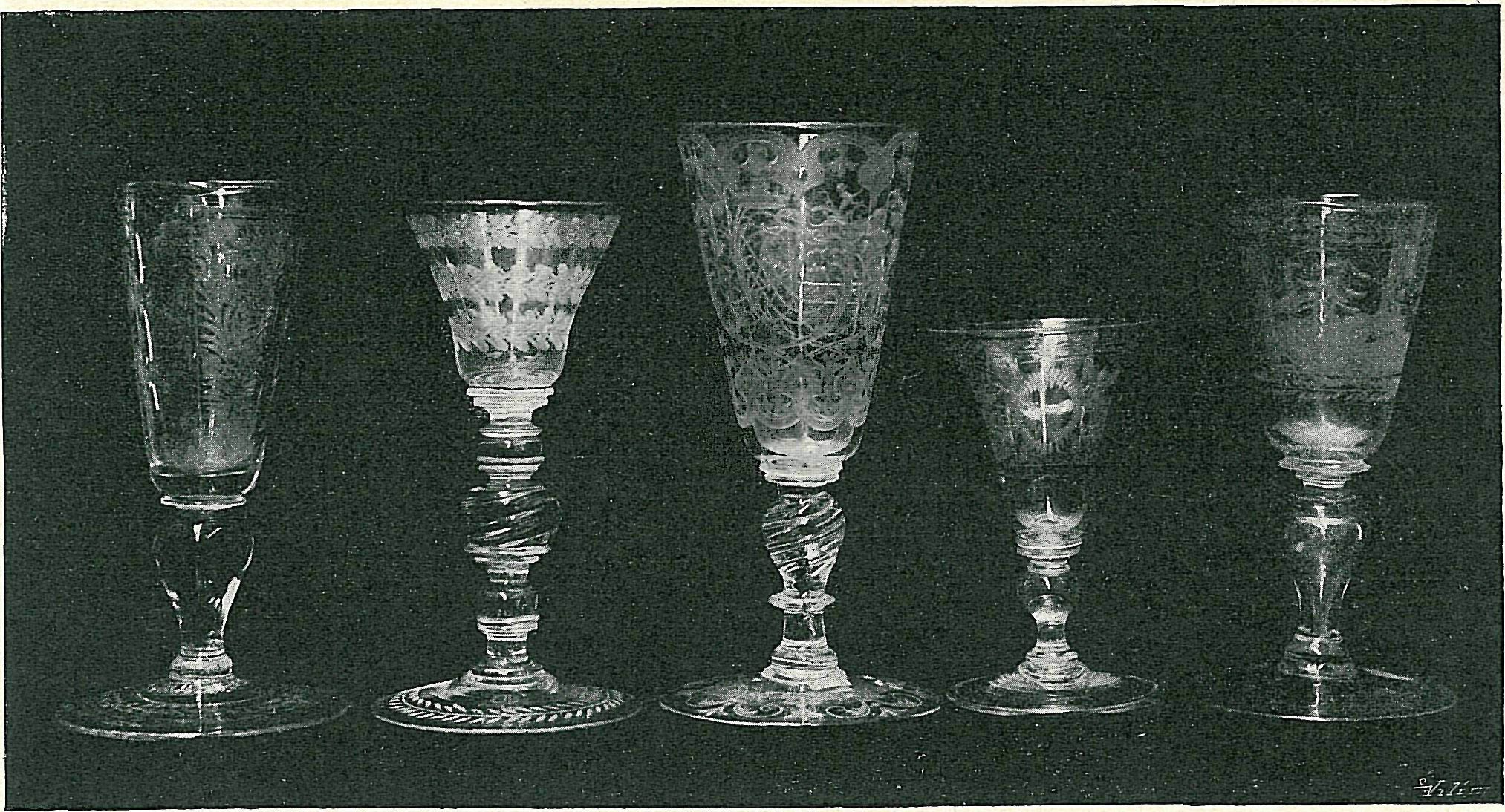 Skupina broušených pohárů ze XVII. a XVIII. století.