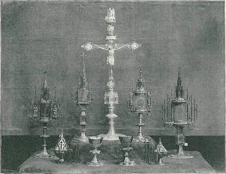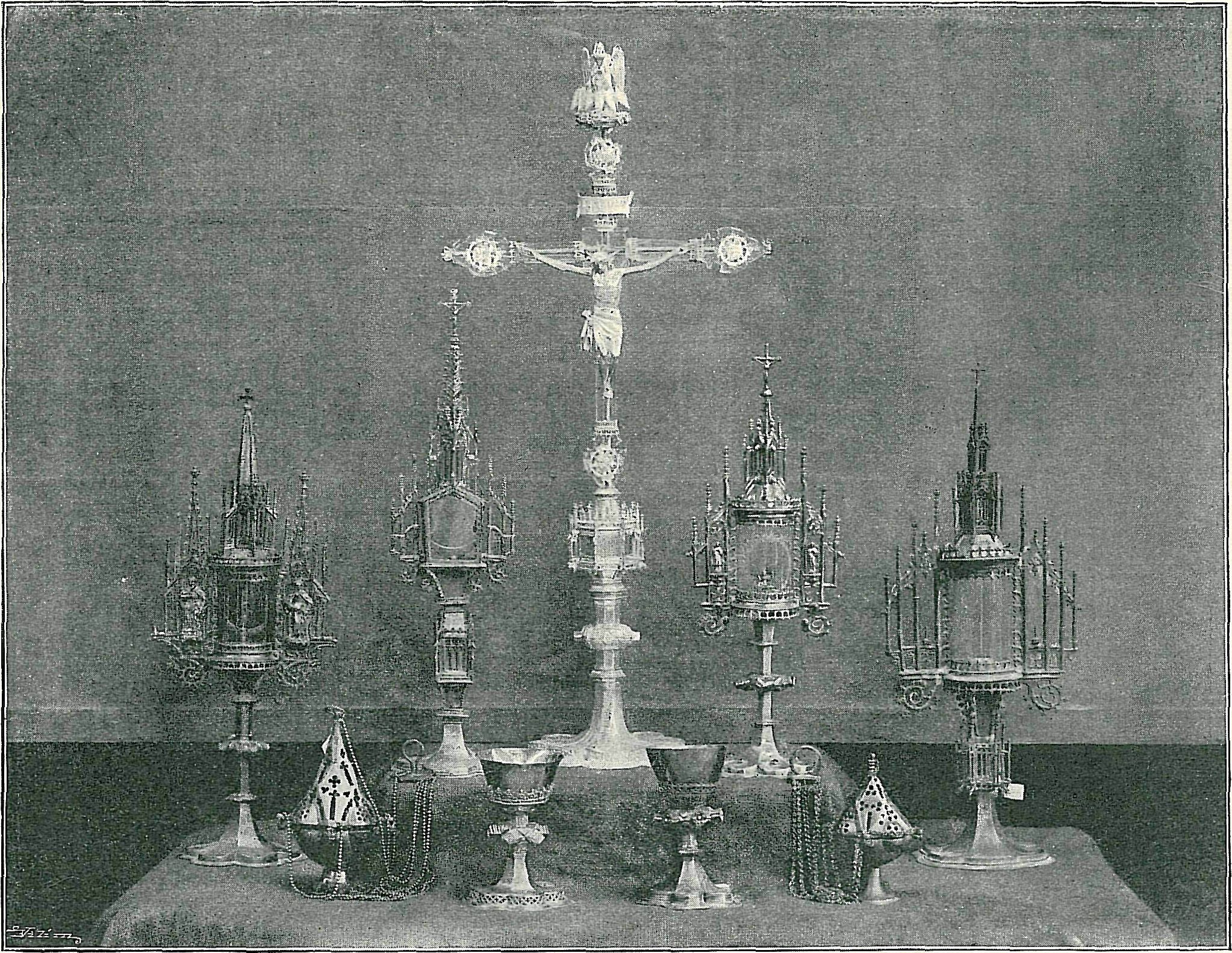 Monstrance z Řeporyj —Kaditedlnice z musea Litomyšlského — Monstrance z Husince —Kalich z Těšína. — Křišťálový kříž z Uher. Hradiště — Kalich z Frýdku. — Monstrance z Rokycan. — Kaditedlnice z byv. kláštera Sázavského — Monstrance Mělnická.