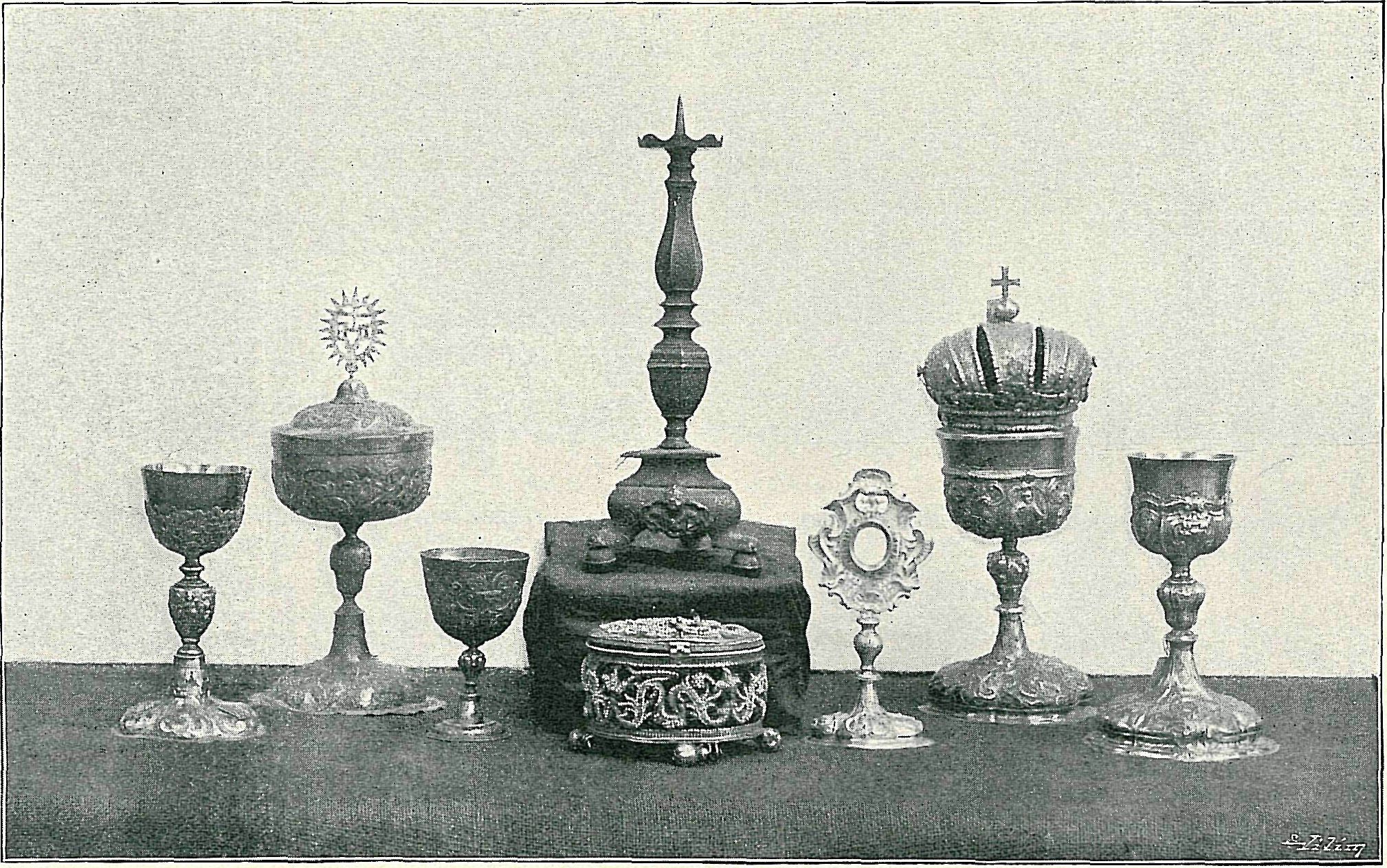 Renesanční kalich z Hnojniku ve Slezsku. — Renesanční ciborium z Prahy (majitel p. prof. Novák) — Kalich z Král. Hradce. — Bronzový svícen p. Klementa v Praze. — Ciborium z Král. Hradce. — Barokový relikviář ze St. Boleslavi. — Ciborium ze Železného Brodu. — Barokový kalich z Klatov.