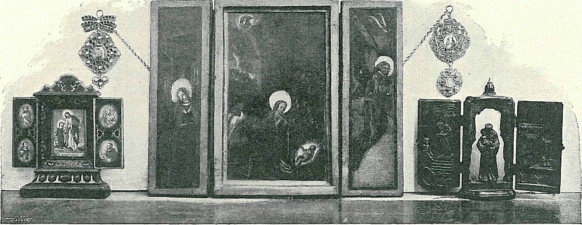 Konečně nescházely zde známé lidové, vyřezávané a na tyčinkách upevněné odznaky umučení Páně, jako: ruce, nohy, sekery, kladívka, houby, lopatky, kopí, žebříky, meče a kohoutky, které se velmi často do foukaných nádob ze skla vkládaly. Takových skleněných láhví viděli jsme hojnost v lidovém oddělení.