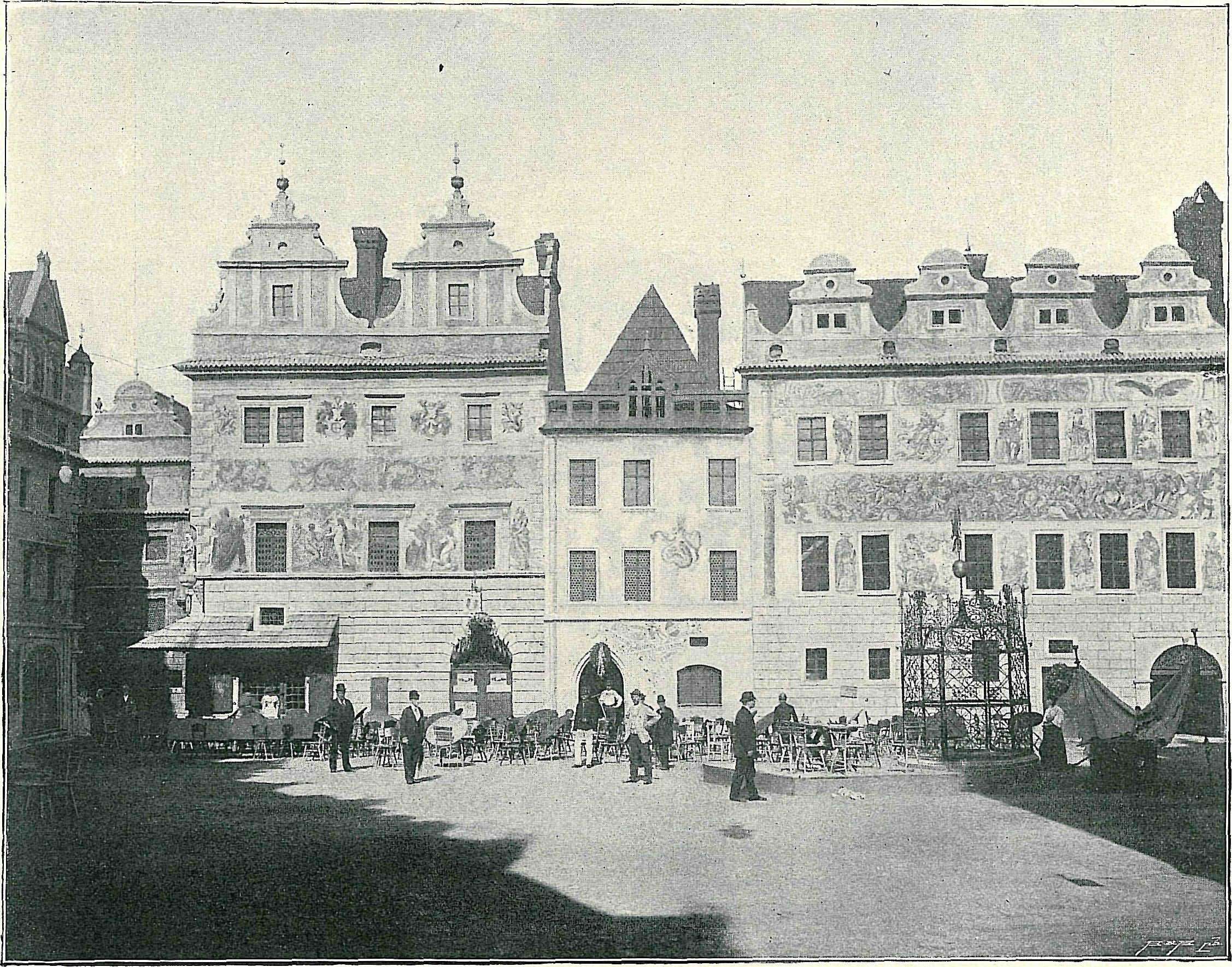 Vídni« na vídeňské divadelní výstavě roku 1893 nebyly zevní omítky budov z malty, nýbrž kostry dřevěných budov byly plátnem potaženy, plátno olejováno, pískem posypáno a pak do tonu omítky zbarveno. Ale tato imitace, ač laciná, nedělala přec dojmu opravdivosti a přirozenosti. Proto rozhodnuto, aby při stavbě Staré Prahy v zájmu solidnosti dřevěná kostra budov z venku prkny se pobila, zrákosovala a maltou omítla, a pokud možno římsoví i kordony a nad-okenní římsy z malty provedly, aby tak dojmu opravdivosti docíleno bylo. Po zjištění půdorysu domů, určení jich průčelí co do slohu a výšky pater, udala se minimální hloubka budov sama sebou.