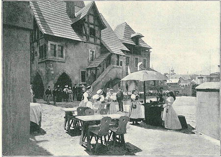 Čís. 14., čásť dnešního domu čís 138 v gotickém slohu s loubím ze XIV. století, spodek proveden jako stavba kamenná, kdežto vrchní čásť má dřevěnou pavlač a prkenné štíty, jak to v tehdejší Praze tak zhusta bývalo; návrh pochází od Cechnera, v přízemí byl po čas výstavy »mincverk« čili pregéřská dílna mincí p. J. B. Pichla.