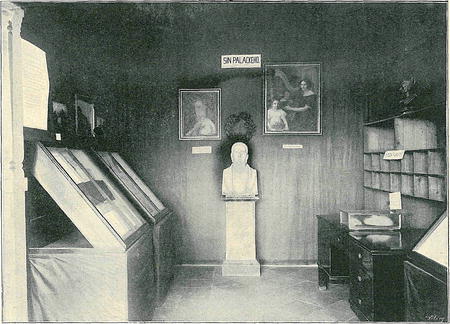 V jedné z nich, nad kterou byla upevněna malá sádrová soška Kollárova, vystaveno několik fotografií a vyobrazení, která měla zobraziti některé vztahy k jeho životu. Viděti tu několik podobizen básníkových, pohledy na jeho rodiště Mošovce, fotografie míst, kde se básník ve svých studijních letech zdržoval, hlavně obrázky, jež týkaly se jeho pobytu v Jeně. Jedna ilustrace zobrazovala nám jeho proslavenou Mínu z let, kdy básník pojal ji v jejím čtyřicátém roku za manželku. Některé ukázky korespondence Kollárovy, zapůjčené pro toto oddělení paní Augustinovou z bohaté pozůstalosti V. Želeného, seznamovaly nás jednak s Kollárovým písmem, jednak dávay nám nahlédnouti do jeho rodinných poměrů, jednak byly důkazem širokých styků Kollárových s celým Slovanstvem, zejména s vynikajícími muži polskými. Drobňounkému a hustému, ale při tom velmi úhlednému písmu Kollár přivykl si za svých let tísně a strádání; drahý papír nutil ho, aby ho hleděl co možná málo popsati. Tisková stránka nepojme tolik, jako jeho stránka psaná. Své