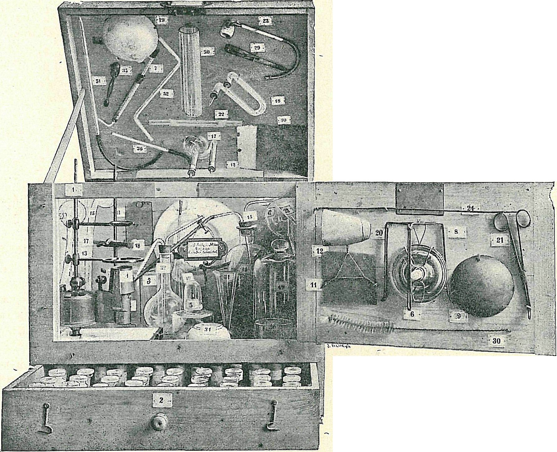 Veškeré předměty háčky se šroubovými závity anebo drátem upevněny na stěnách, dně a víku skříně tak, že po otočení háčku neb uvolnění drátu lze je ze skříně vyňati. Při dopravě drahou a p. pro úplnou bezpečnost plní se skříň hoblovačkami. Sestavy přístrojů ve skříni vystačí dle zkušenosti pro veškeré pokusy lu-čebné, ve školách obecných a měšťanských prováděné. Po zavření dvířek a sklopení víka lze skříň na klíč uzamknouti. Po vsunutí zásuvky, obsahující lučebniny, lze tutéž dvěma háčky upevniti. Délka obnáší 59 cm, šířka 48 cm, výška 54 cm.