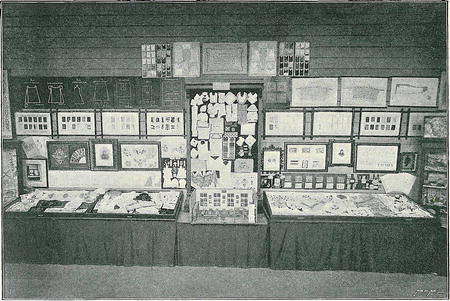 nápadně svědčilo srovnání vystavených starých prací namnoze neužitečných, titěrných i nevkusných s pracemi novými, téměř veskrze praktickými, dívky všestranně cvičícími a na nejvyšším stupni, ve školách měšťanských, již i samého umění se dotýkajícími. Práce žákyň doplněny jich poznámkami, sešity výkresův, ukázkami střihův a p. Rozumí se, že i zde byly pomůcky vyučování hromadného, hlavně nástěnné diagramy a výkresy, vzorné ukázky prací, vzorky látek a náčiní (mezi nimi razítka Opitzova se vzorky lidového ornamentu), příslušná literatura (v níž vynikající Škola ručních ženských prací). Model pracovny, fotografie dívek při práci, statistické diagramy o počtu míst a nákladu doplňovaly tuto bohatou a v skutku původní, českou výstavku. —
