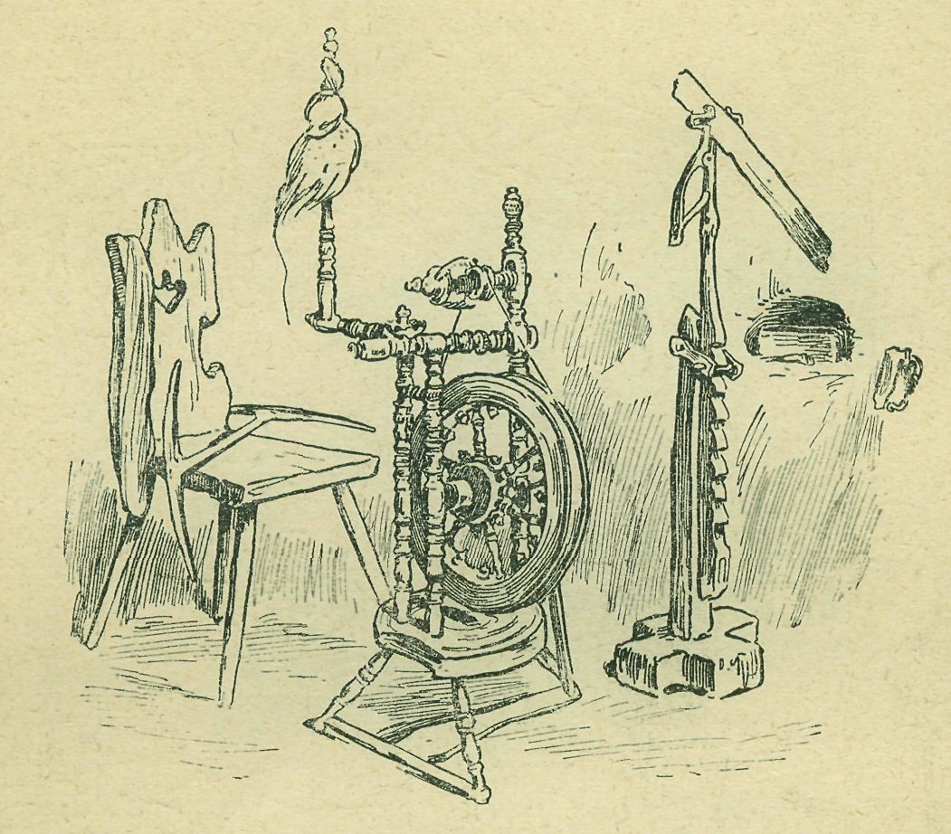 věncích jest toho dost nalepeno. Na vršku nalézá se rozmarina se strakatými fábory. Ten věnec nese si královna domů; něco rozdá mezi přá-stevnice, něco nechá pro sebe. Po půlnoci starší se rozešli a chasa zůstala. Již svítalo, když královnu provázel s muzikanty k vratům; stiskli si ruce, dali si dobrou noc a když muzikanti vyprovodili i krále, bylo po dlouhé noci . . . Dnes již není ani po dlouhé noci, ani po vrkoči potuchy. Všecko jako by se do země propadlo. Jiný čas, jiný věk, nevrátí se již přástka s dlouhou nocí a s vrkočem a s něžnou, symbolickou radovánkou zimní . . . Jak si představíme přástky podle líčení Boženy Němcové, znázornil akademický malíř Ad. Kašpar zdařilou kresbou ve skvostném vydání Babičky od Unie. Viz obr. 8. Zároveň připojil kolovrat, loučnik. křesadlo s hubkou, jak to vše čekalo na příchod přástevnic. Viz obr. 9,