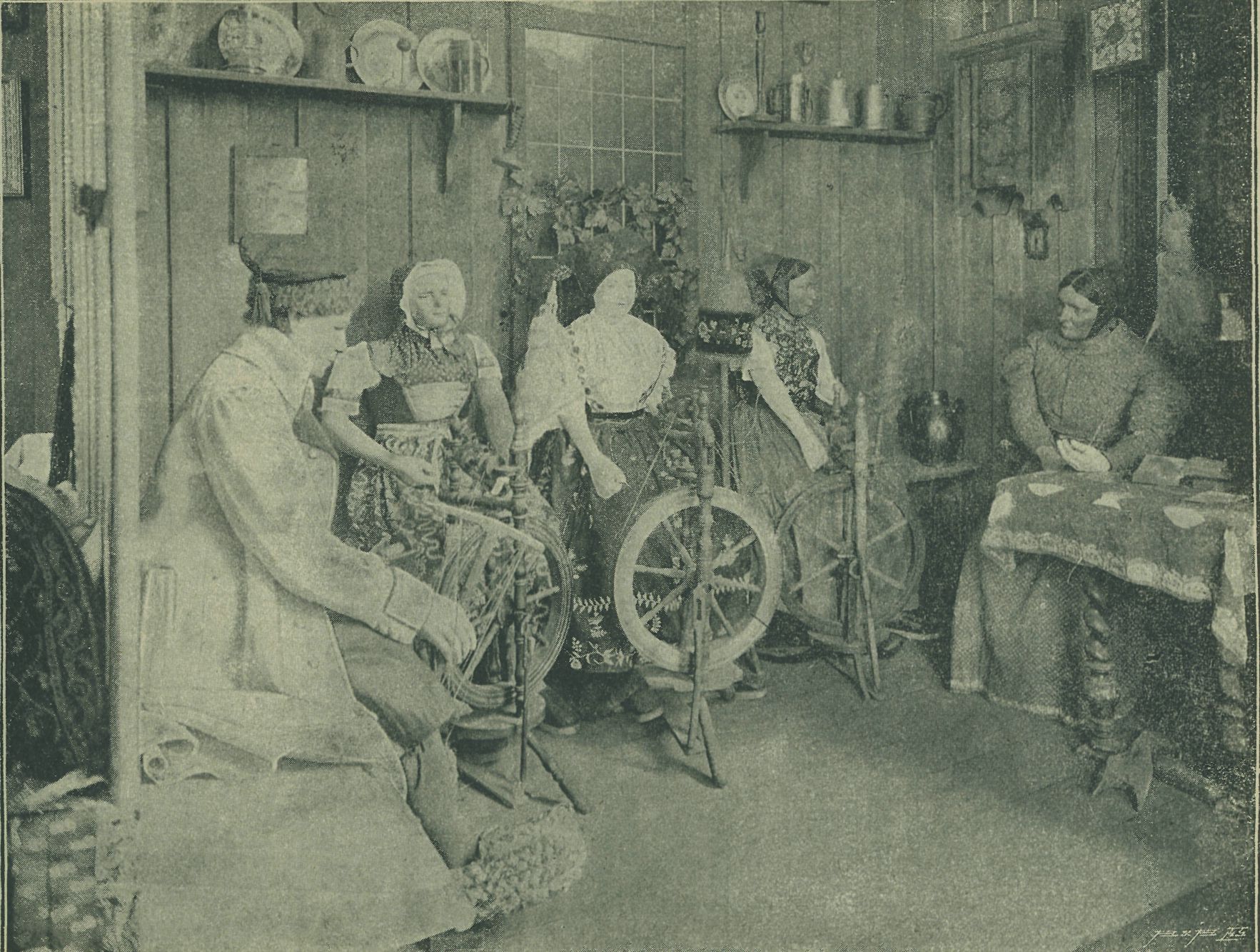 oblečena v bývalý evangelický kroj z okolí Budyšína, první pradlena na levo jest dle červeného čepečku z okolí Slepého, prostřední dle uměle