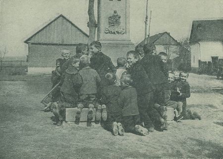 S kém ideš? Nemáš klepačku? Tož běž dom. Maminka pečó rukavicu,. dostaneš palec! Spořádat se a pěkně if!« Napřed dvá velicí. Ti vedó, aby se nešlo ani honem ani pomaly. Za němá ostatní podle véšky. Po stranách dávajó štyří věcí pozor, aby všecí sténo klepali, a pěkně docházeli. Nestarší: »Jedna, dvě, tři« a klepáčí se hnó. Obendó třikrát' kole kostela — jak docházijó po třetí ke křéžu před kostelem, každé hr k němu, aby se dostal na stupínek. Na holé zemi nechce žádné klečet. Aspoň jedném kolenem na kamenu. Pomodlijó se »Anděl Páně« (viz obrázek 35 je jich kolem kříže) — jejich modlitbu istě nenesó andělí v baňkách do nebe — a zas všecí do řady, jak byli. »Jedna, dvě, tři!« a idó dál k zabráno. Jak idó po straně, klepó otevřítéch kulné, oken, lebo hde sto-ijó ve dveřách. Ai do německé hulice včil chodívávajó odzvonit železná-