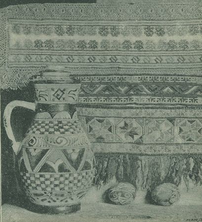 Obr. 111. Kraslice slovácké z okolí Velké se džbánem »bedněným« a konce šatek pro srovnání ornamentiky.