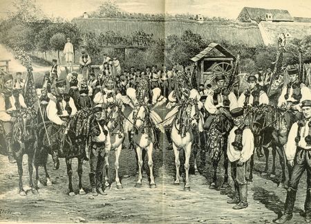 Jízda králů ve Vlčnově na moravském Slovácku 1890. Podle fotografie fed. J. Klvani kreslil Josef Ulrich.