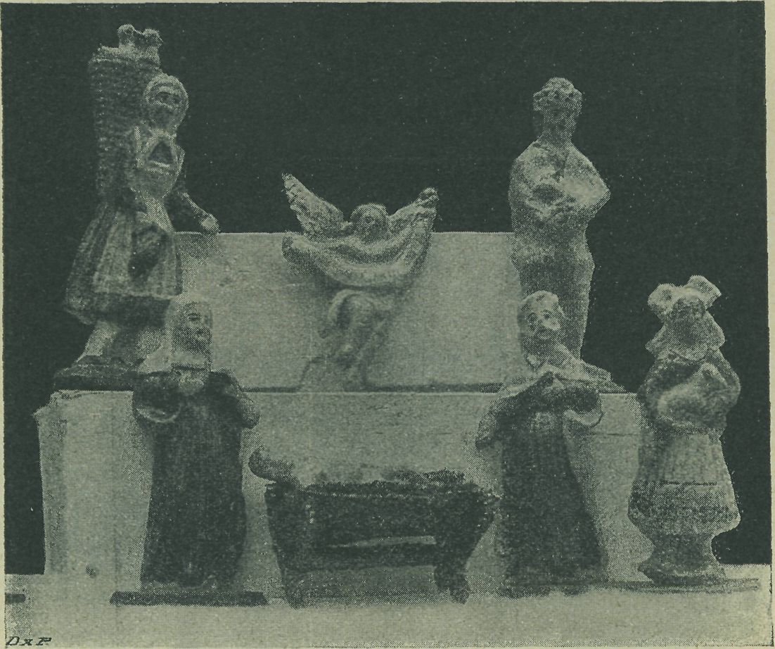 ze dřeva, ze sádry a pod., prostě nebo s pohyblivými stroji, více méně umělými, ať v domácnosti nebo v kostele, ať při obchůzkách a hrách koledníků s jesličkami nebo když jesličky se rozšířily ve zvláštní vánoční divadelní výjevy. Překvapuje tu primitivnost u starších figurek, skupin i zase dovednost u novějších jesliček, v nichž vždy podle stáří a původu obráží se život souvěký, kroj, nářadí, domácnost, představy o narození Páně. Srv. figurky na trhu Mikulášském, chystané jesličky, ve stati o sv. Mikuláši. Nevyhýbá se spisovatel*) dále ve věcné souvislosti ocenění umě-