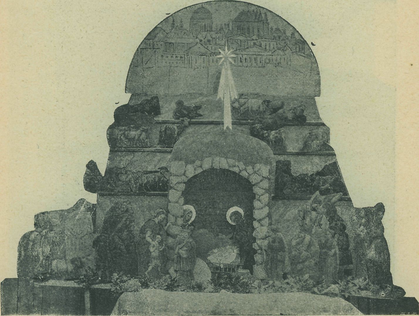 narození Krista Pána postavením si většího nebo menšího dle poměrů majetníkových »Betlema«, ladně seskupeného obrazu města Betlema, chléva s děťátkem, před nímž klečí Panna Maria a sv. Josef, výše na stráních pastýři dary nesou, ovce pasou a před andělem narození Krista jim zvěstujícím se klaní. Živá obrazotvornost lidových umělců řeszbářkých, kteří si veškeré postavy a to zvířata domácí, pastýře, darovníky a mnohdy i humoristické scény při nesení darů sami vyrobí, přimísí k těmto biblickým postavám lidi z doby naší: kominíka na komíně, pana otce před mlýnem, chudého tkalce s rancem k jeslím běžícího, darovníky na tra-kařích, na krusnách a v koších štědrovnice a jiné dary Ježíškovi přinášející. Viz obr. 24.