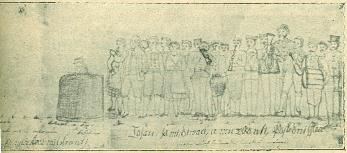 Pomalu scházeli se muzikanti a domácí synkové; některý z nich přinesl sebou kohouta, který se měl před večerem voditi průvodem skrz ve?, a pak stínati. Když se nž celá ves před hospodou sběhla, jeden z muzikantů oblekl si na vrch přes svůj oblek druhou mužskou košili, na hlavu čepici do špičky a vysokou. Natřel dole košili pískem z brusnice, žele-zitou rzí do červena zbarveným. Jiný hoch neb muzikant ustrojil se za kata. Ten zase vzal si na ramena nějakou červenou sukni a Červenou čepičku z papíru na hlavu, kalhoty bílé měl přitočeny těsně k lýtkům a zastrčeny do nízkých střevíců.