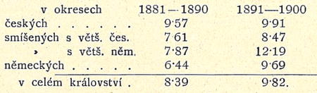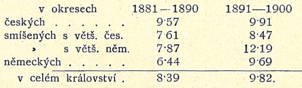 Nepříznivé poměry předminulého desítiletí co • do všeobecného vývoje obyvatelstva byly tedy v posledním desítiletí v neprospěch český ještě více stupňovány. Tak přibývalo v desítiletí 1881—1890 v ryze německých okresech o 1,13% rychleji než v okresech ryze českých, v posledním období však již o 3,27% rychleji než v oblasti ryze české.