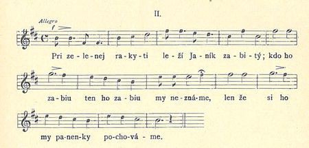 Kde že pochováme ho, kde že položíme ho? Pochováme ho do hájka ; tam na hrobe zpievavat mu bude slavik v nočnej dobe. — Jeho věrná Mariška, oplakává Janíčka. »Zomrem od zial'u vel'keho, pamätajte, a potom ma к Janíkovi pochovajte.« — Od jaseni do jary, spadly růže s jej tvary, esce v poli bielé zítko nepožali, už mládenci pre Marišku hrob kopali. — . Vykopali jamičku к jej věrnému Janíčku. Hrob pri hrobe, telo s telom položili a na hrobe po ružičke zasadili. —