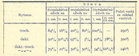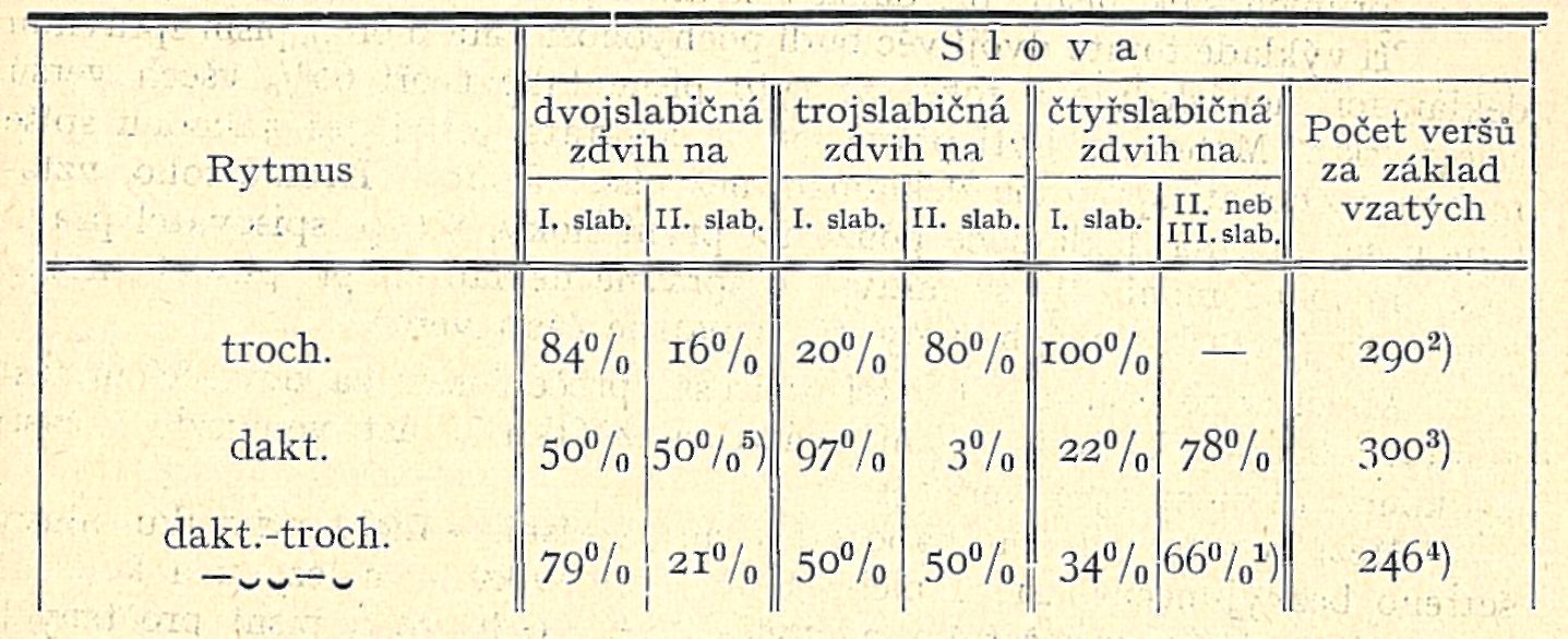 noho každého rytmu šetří se prízvuku mluvy. O tom nás nejlépe poučí přehled veršů trochejských, daktylských á dakt.-trochejských, z něhož poznáme, kolik procent slov dvojslabičných až čtyřslabičných při písních různého rytinu má zdvih na první,: druhé neb i třetí slabice.