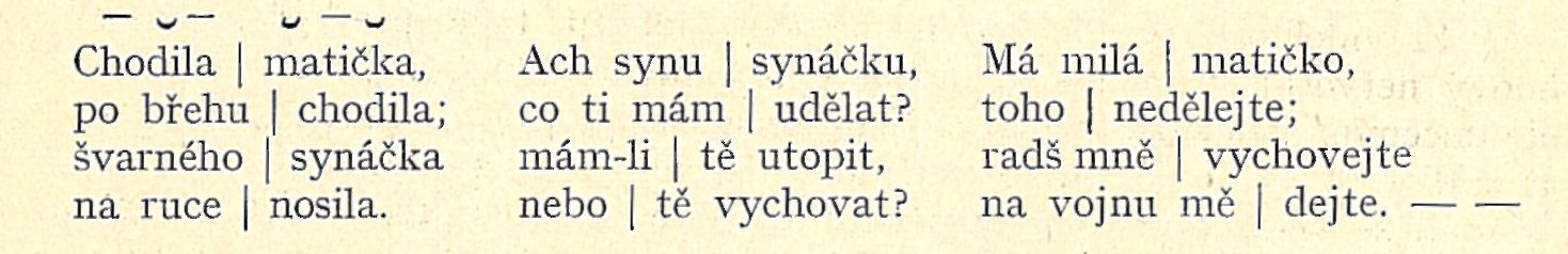 Naopak nepravidelné jsou tyto verše: Tvá matka | tvrdě spí (523/2) — ovečky I domů hnal (549/26) — což jeho | vraný kůň (549/27) —