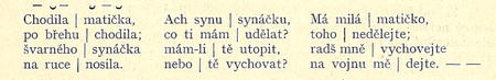 Příklady veršů čtyřstopých s přerývkou: 340/47, 394/185, 420/81, 286/641, 289/656, 311/779.. Verše pětistopé: 120/43, 171/255, 203/341, 491/300, 462/153, 40/119. Ze čtyřstopých bud uvedena tato píseň:
