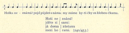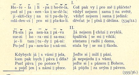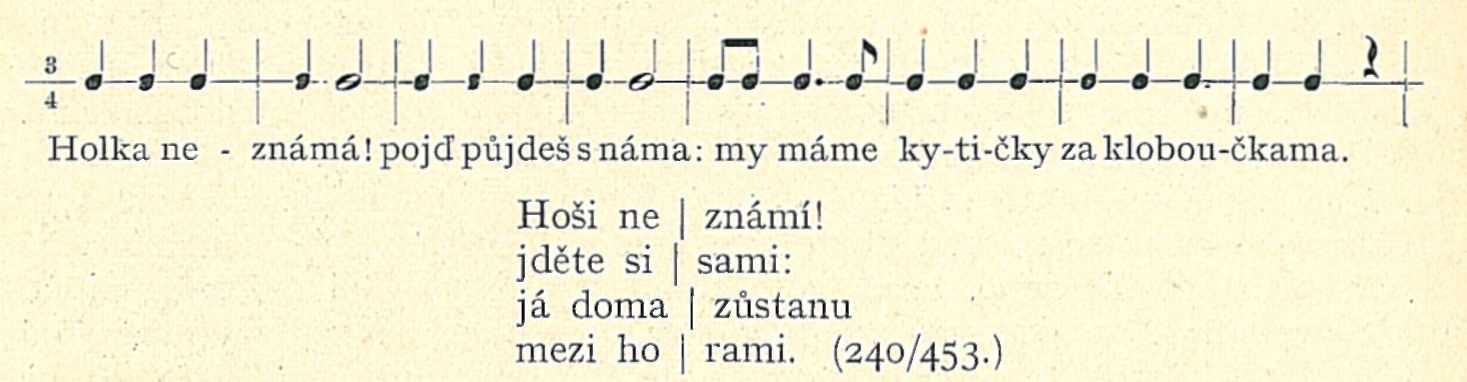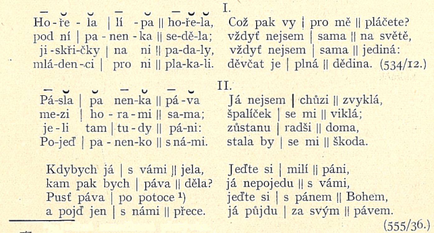 Jak viděti z této ukázky, pěvec pronáší na dva takty o třech a dvou notách vždy pět slabik. Proto mu jsou nej příhodnější slova dvojslabičná a trojslabičná, jichž spojením vznikají dvě stopy, a to daktyl s trochejem. Kromě toho mnohdy jednoslabičná bud sama osobě tvoří stopy neb ve spojení se slovy dvojslabičnými.