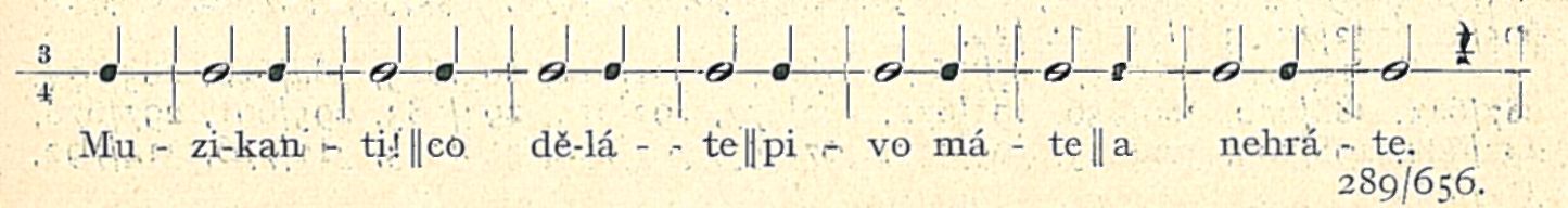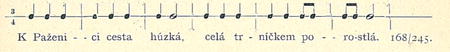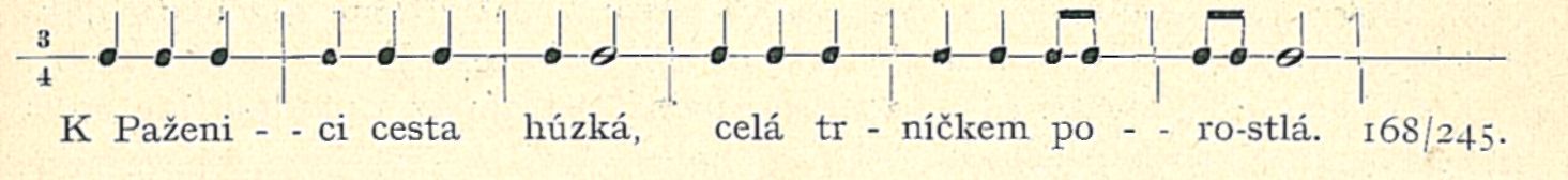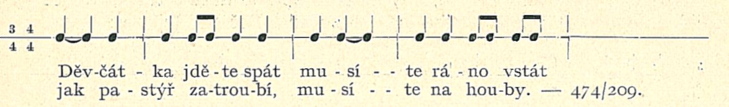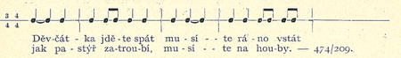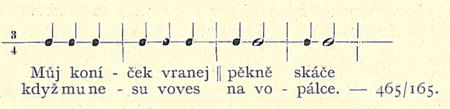 Někdy není text písně rytmicky tak průzračný, abychom mohli určitě stanovití poměr jeho к nápěvu. Na př.