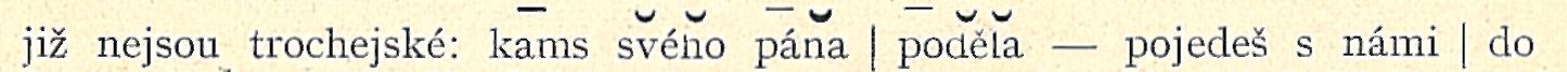 již z této ukázky je viděti, že některé verše nejsou rytmu daktylsko-trochejského (3. a 4. verš) a jiné zase že nejsou rytmu trochejského (2, 6, 8). Tak tomu je též v ostatních verších. Jest pravdě podobno, že celá píseň (o 50 verších) byla původně trochej ská, avšak že časem při ní se ujal nápěv o taktech střídavě trojnotových a dvoj notových, který si několik veršů (8) přizpůsobil, tak že rytmus trochejský v nich ustoupil daktylsko-trochej-skému. Kromě uvedených veršů jsou ještě tyto, které v nynějším znění