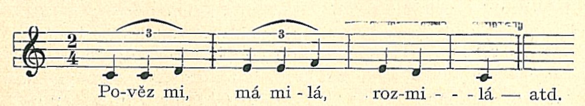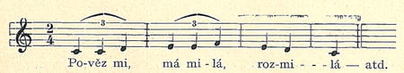 Notujte napřed zpěv a potom hru hudců. Nápěv písně ve hře hudců zhranatí. Na př. žena s Vrchů nad Ostravicí zpívala: