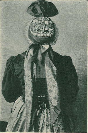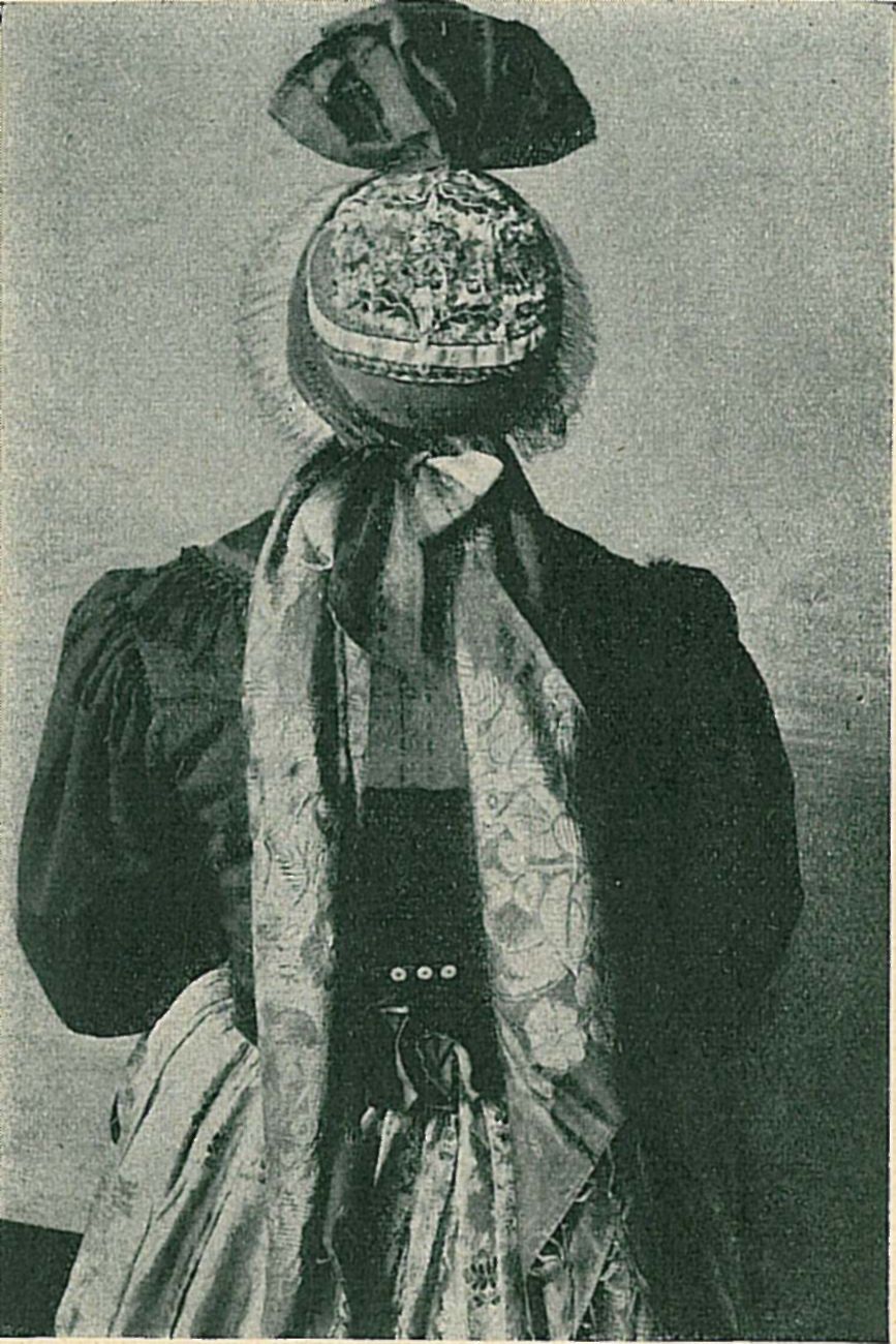 Aby dobře „lopaty" stály, bývaly konce mašlí protaženy' drátem. — Naposledy vázaly za věncem svinutý hedvábný šátek, jejž naď čelem nasadily v půli a v týle v uzel zavázaly. Konce uzlu, jež byly dosti dlouhé, visely dolů po zádech. Tím byl ústroj hlavy ukončen. (Tab. IV. а V.)